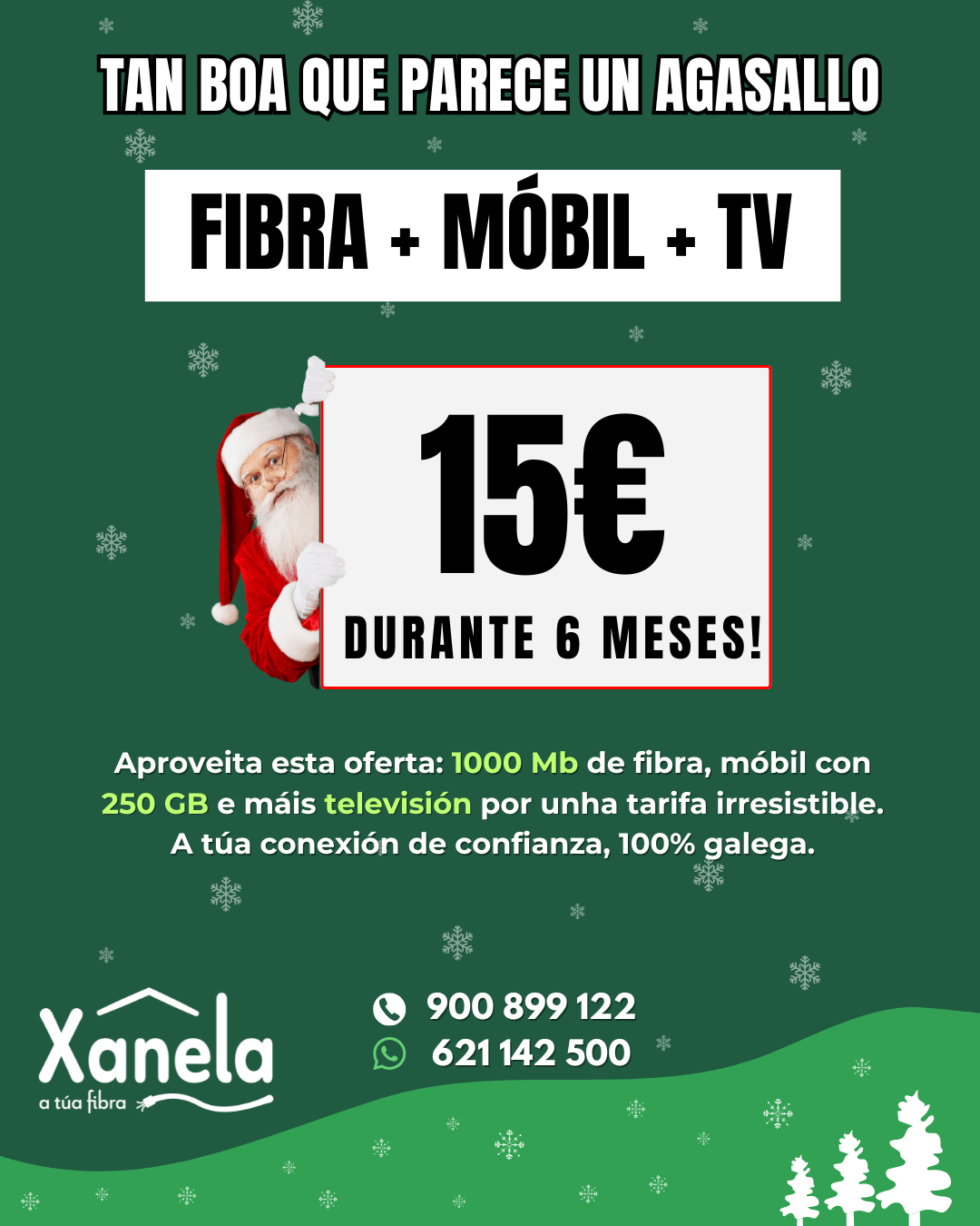 Preparad@s para o Nadal? En Xanela sí, e cunha oferta incrible coa que desfrutarás de seis meses de fibra, móbil e televisión por só 15 euros ao mes! O mellor agasallo de Nadal!